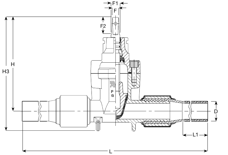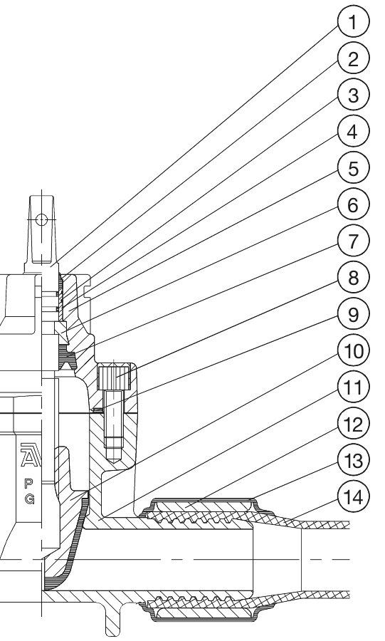 - Een standaard PE buis wordt geperst op het gegroefde uiteinde van de schuifafsluiter, daarna afgesloten met een stalen ring en dan verzegeld met een krimphoes. De boutloze en volle doorlaat PE verbinding is trekvast en sterker dan de PE buis zelf. Het uiteinde is geschikt voor rechtstreeks lassen op PE buizen wat resulteert in een snelle en veilige montag